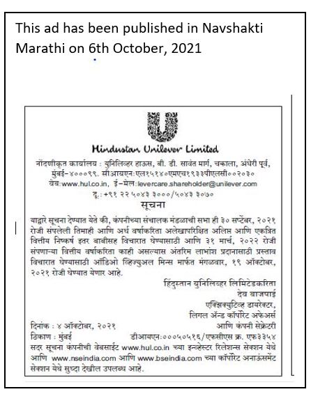 Notice is hereby given that a meeting of the Board of Directors of the Company will be held on Tuesday, 19th October, 2020 through Audio-Visual means, inter-alia to consider the Unaudited Standalone and Consolidated financial results for the quarter and half year ended 30th September, 2021 and to consider the proposal for payment of interim dividend, if any, for the financial year ending 31st March, 2022. The record date for the purpose of determining the entitlement of the shareholders for the interim dividend, if any, has been fixed as Wednesday, 27th October, 2021.
