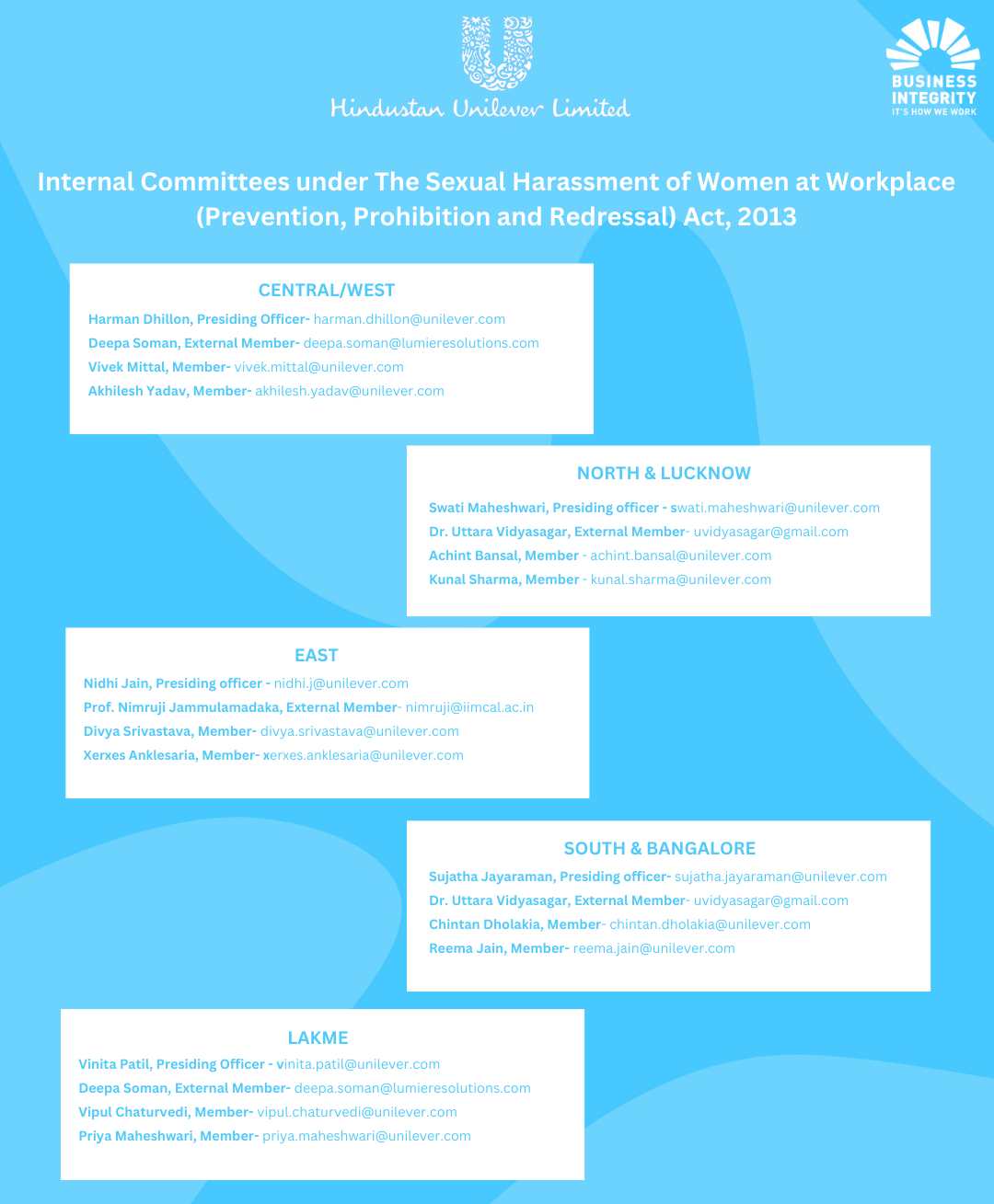 We have 8 internal committees responsible for dealing with sexual harassment complaints. Details of these committees are made available in each location. All issues of sexual harassment are treated with confidentiality, and we ensure no retaliation.